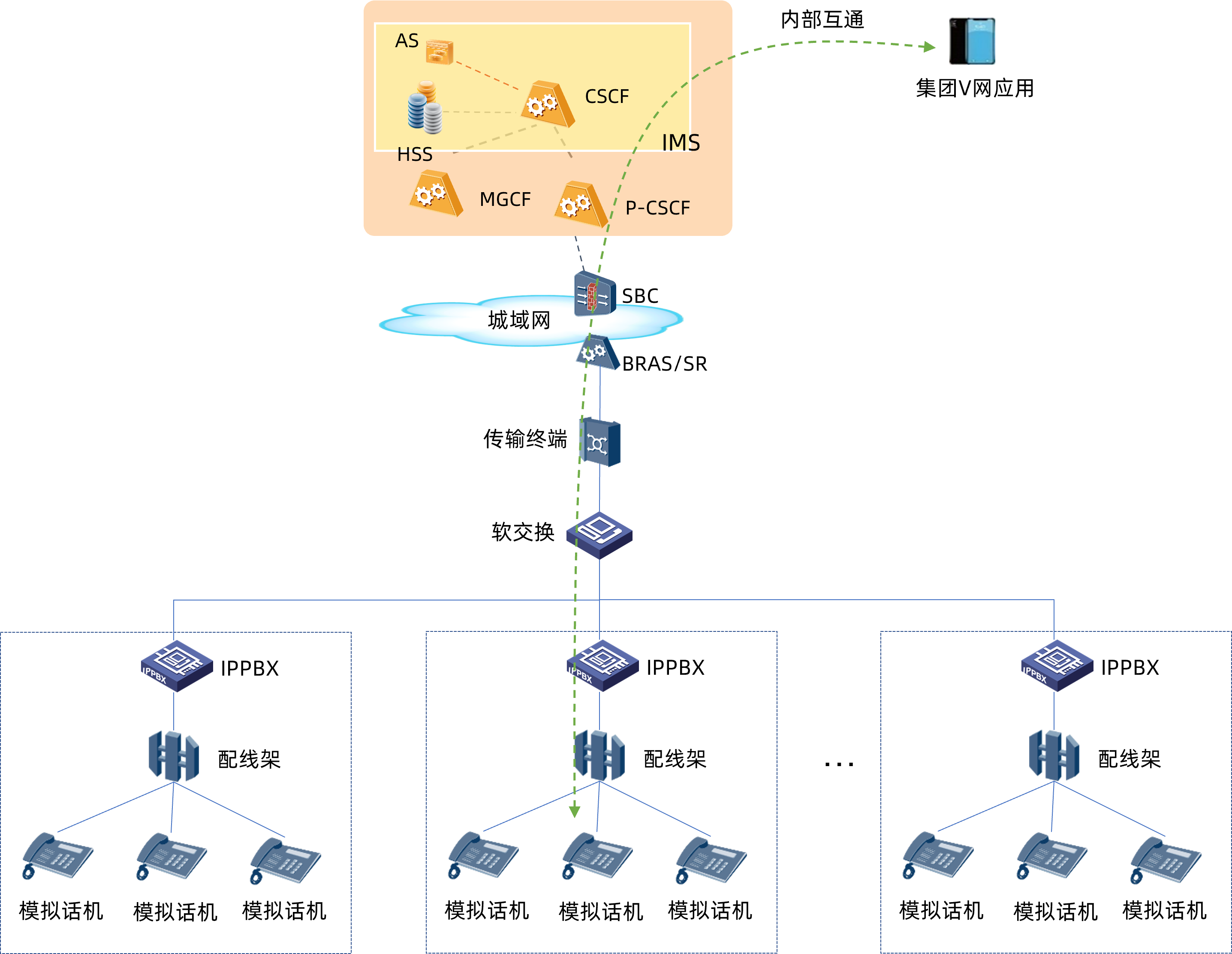 软交换作为语音通信网络的汇聚节点和承载枢纽,通过以太网口上联传输终端接入城域网,注册至运营商核心侧SBC服务器,来承载核心网IMS业务和端口号码的下发,实现内外线功能,并实现固话和手机短号互拨的综合V网业务。