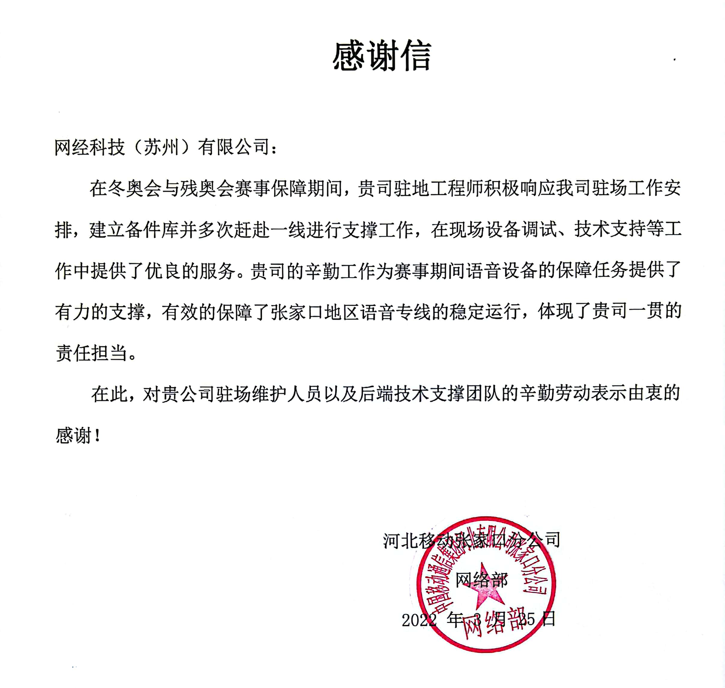 在2022北京双奥期间,开云体育河北办事处积极响应河北移动安排,在现场建立了语音设备备件库,并24小时待命提供技术服务,尽最大努力,在现场调试、技术支持等工作中提供了优质的服务,完美保障了张家口地区语音专线在双奥期间零故障稳定运行,为双奥保障工作发光发热,得到了河北移动的高度肯定与感谢。