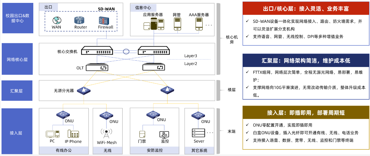 随着教育信息化从1.0时代迈向2.0时代,各校园为了建设功能更加丰富的校园网络(例如多媒体教学、融合通信、广播调度等),使得教学楼、食堂、门卫、办公楼、宿舍楼、图书馆等校园内设施网络应用更加智慧与协调,均需要校园网络具有高带宽、广覆盖的承载能力。