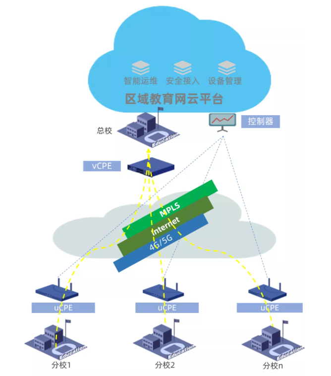 在分校部署SD-WAN技术的uCPE设备,总校部署vCPE;云端或者总校部署SD-WAN控制器,对uCPE和vCPE进行集中策略管理,建立SD-WAN虚拟专线,满足校园分支基于互联网的灵活部署和组网。