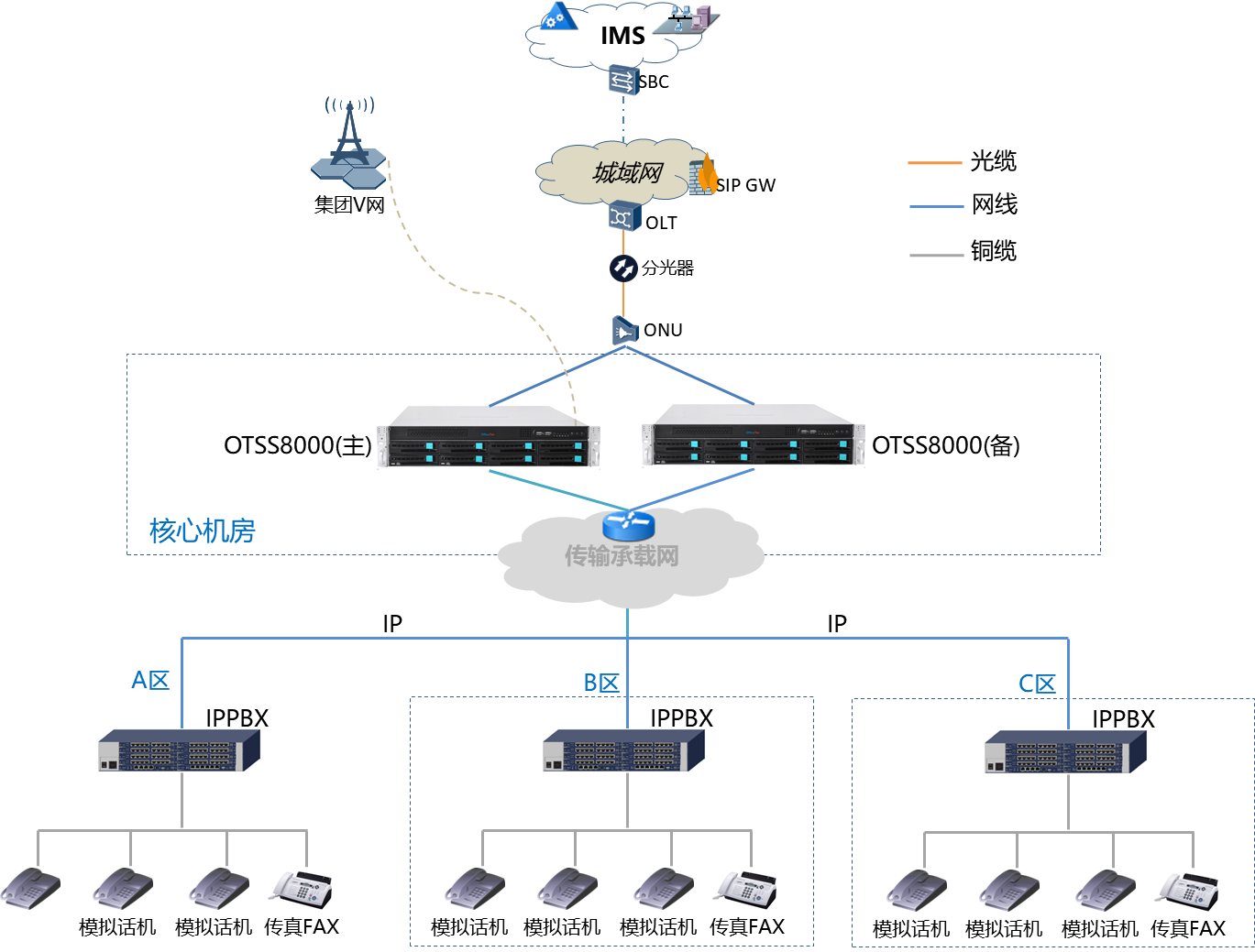 开云体育以软交换OTSS8000为核心,以立体、融合的语音网络构建方式,提供语音通话、视频通话、电话会议、电话录音、电话计费、远程网管、移动分机等综合业务,具备呼叫控制和处理、冗余路由、双机热备等特点,有效降低企业通信成本,缔造沟通价值。