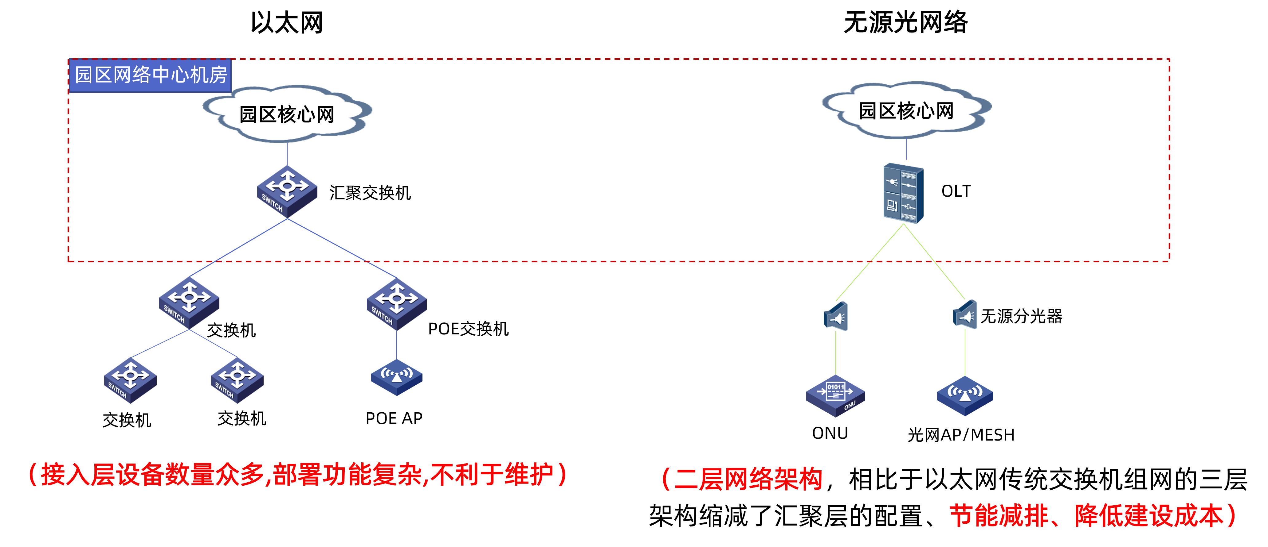 园区各楼的弱电间:每栋楼内设1~3个弱电间,每个弱电间放置光电一体化机柜,通过光缆上联OLT,通过馈电光缆下联大量光网络终端。