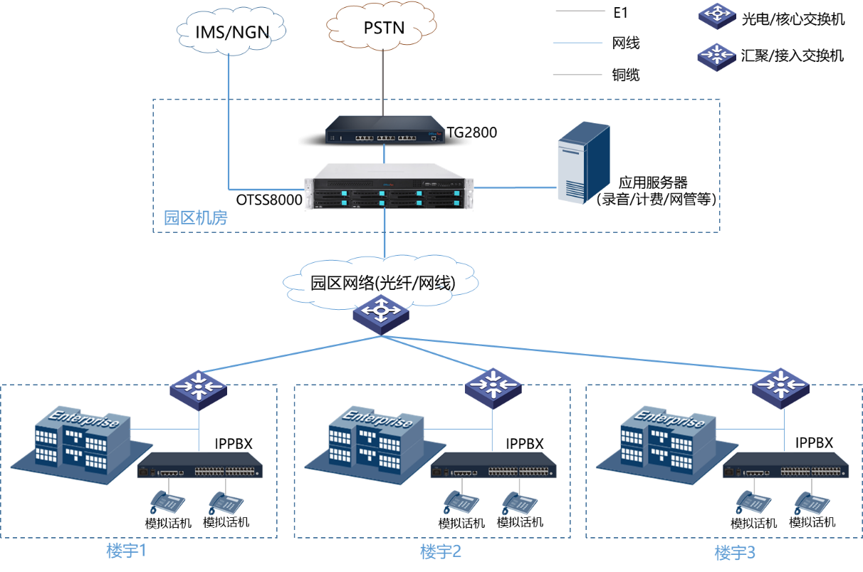 传统园区电话部署方案往往采用大对数线缆连接方案,即程控交换机—机房电话配线架—大对数缆—各楼宇进线间电话配线架—办公室电话模块,传统线缆造价昂贵、工期较长、无法对接其它业务管理系统等。